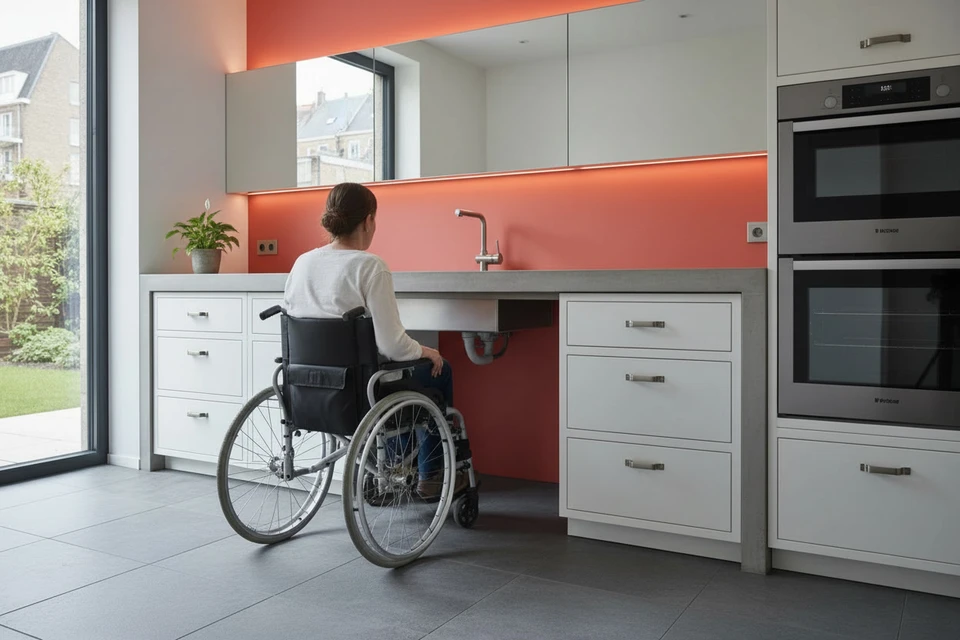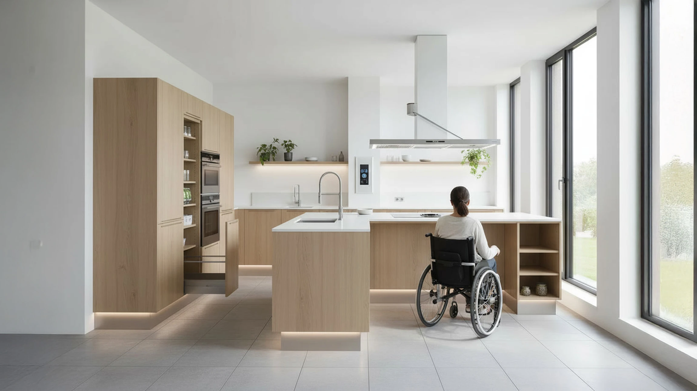 Une cuisine PMR (Personne à Mobilité Réduite) intègre des agencements techniques spécifiques favorisant l'autonomie quotidienne. Ses caractéristiques fondamentales comprennent des plans de travail à hauteur ajustée, des zones de circulation optimisées, des rangements accessibles. L'ergonomie générale minimise les efforts (utilisateur en fauteuil, personne avec aide à la marche, individu présentant diverses limitations fonctionnelles).